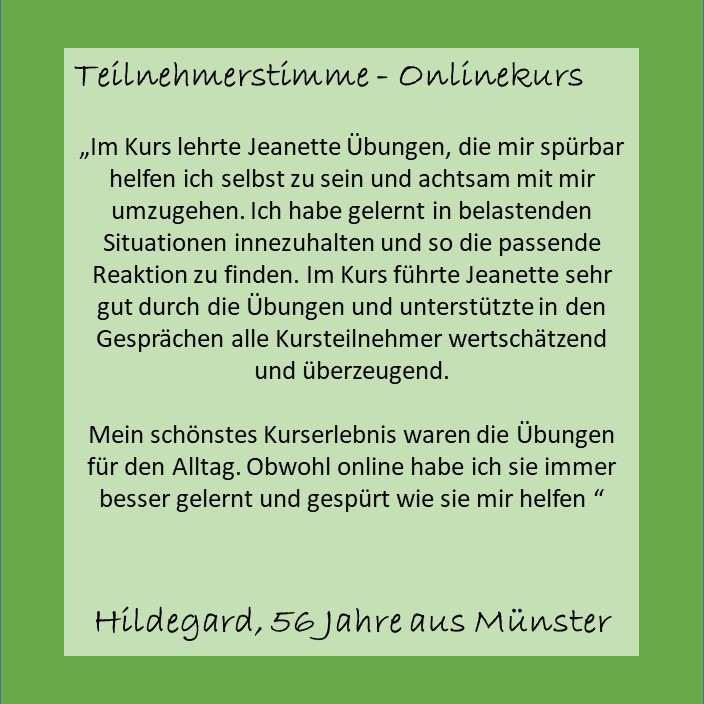 Es besteht die Möglichkeit nach dem Beenden des Kurses individuell zu besprechen,welche Wege und Möglichkeiten es für Dich gibt, die Achtsamkeitspraxis in deinen Alltag zu integrieren und weiterzuführen.